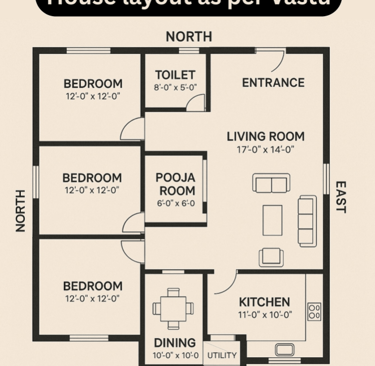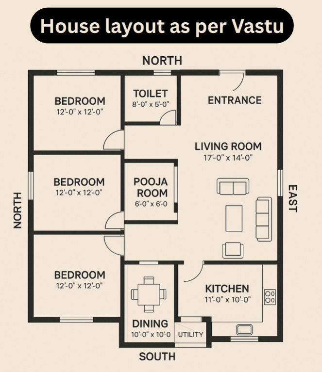 Shared Walls: Ensure the bathroom does not share a common wall with the Kitchen or the Pooja (prayer) room.